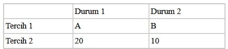 Üst kısımda bulunan karar tablosunda Tercih 1'in güçlü baskın karar olması için sırasıyla A ve B yerine aşağıda yer alan ikililerden hangisi gelmelidir?
