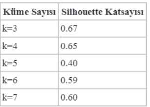 k-Ortalamalar algoritması ile farklı küme sayıları (k=3,4,5,6,7) kullanılarak 5 ayrı kümeleme analizi gerçekleştirilmiştir. Analizler sonucunda elde edilen Silhouette katsayısı değerlerine göre aşağıdaki hangi küme sayısını seçmek en uygundur?