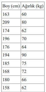 Yukarıda bir öğrenci grubundaki kişilerin boy ve ağırlık ölçümleri verilmektedir. Ağırlık gözlem değerleri, en büyük değer 1 olacak şekilde normalize edildiğinde 72 kg’lık gözlem değerinin normalize edilmiş yeni değeri kaç olur?