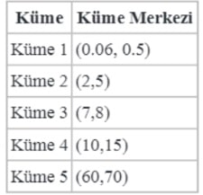 k-Ortalamalar algoritması kullanılarak gerçekleştirilen kümeleme sonucunda elde edilen kümeler ve küme merkezleri yukarıdaki tabloda verilmiştir. Buna göre; örnek veri (3,6) hangi kümeye benzerlik gösterir ve atanır?