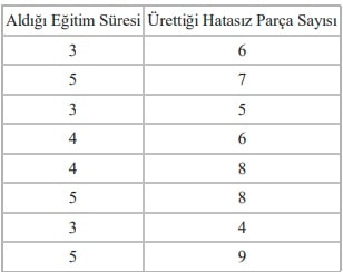Bir üretim hattında çalışan mavi yakalıların işleri konusunda aldıkları eğitimin süresinin (saat cinsinden), günde hatasız ürettikleri parça sayısı üzerindeki etkisi tahmin edilmek isteniyor. Bu amaçla örneklem alınan 8 çalışan için toplanan veriler yukarıdaki gibidir Yukarıdaki bilgilere göre basit doğrusal regresyon denklemi aşağıdakilerden hangisidir?